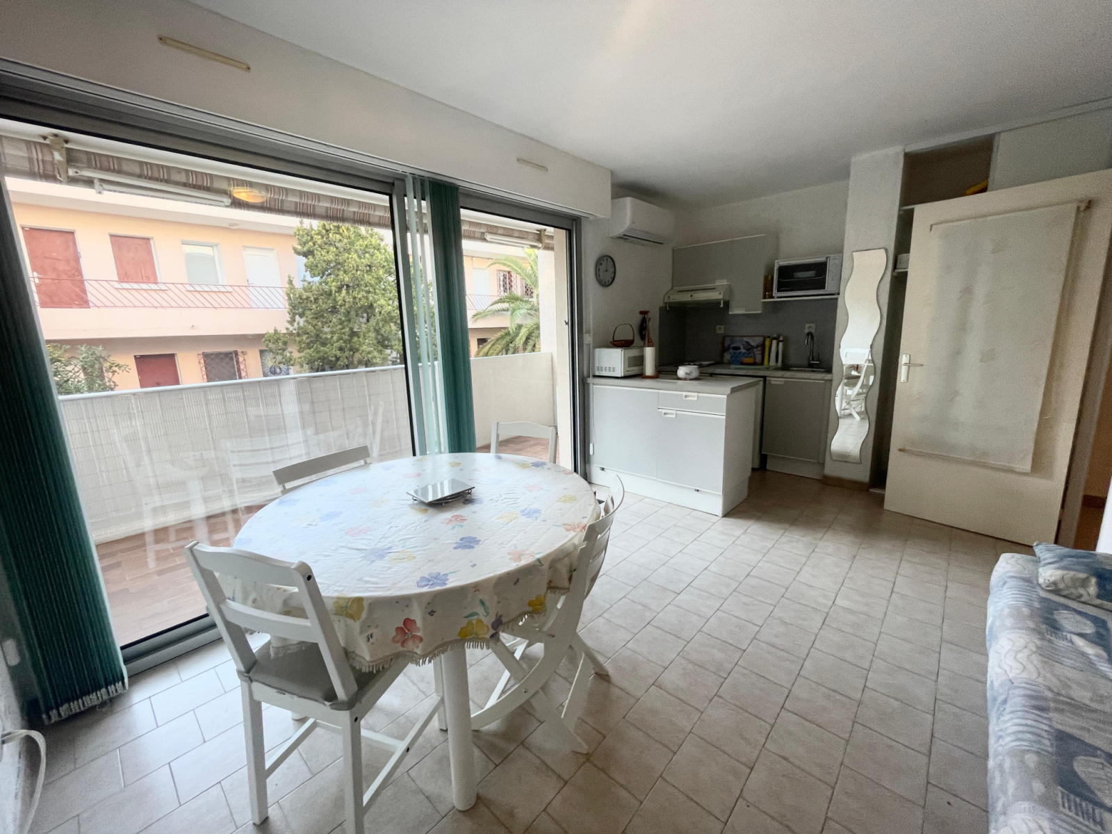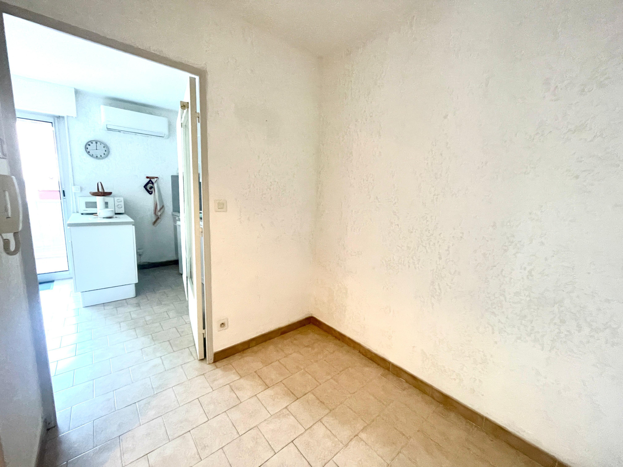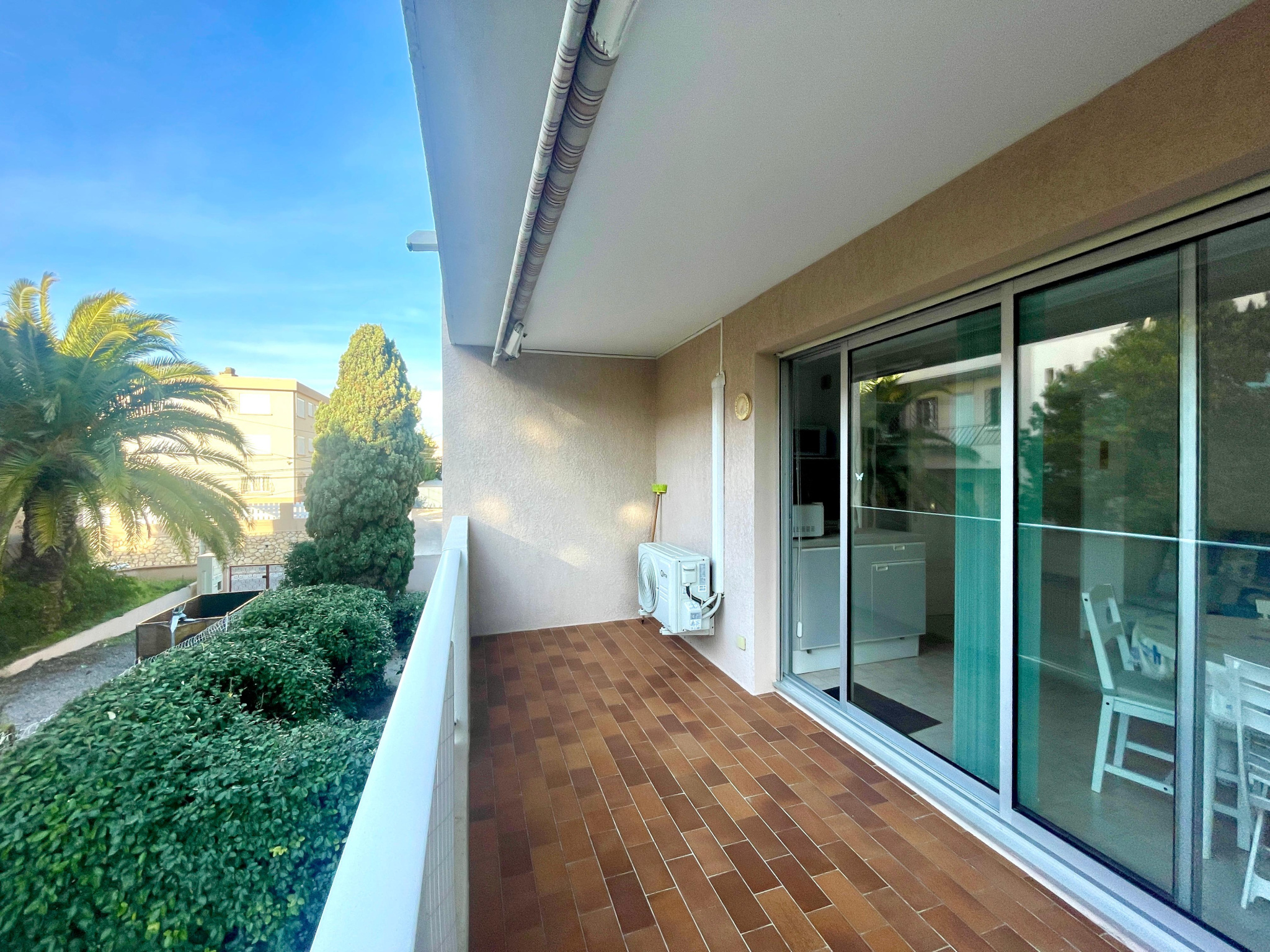 À l’extérieur, une terrasse généreuse et au calme devient un véritable prolongement du logement : idéale pour recevoir, travailler en plein air ou simplement profiter du climat méditerranéen. La climatisation assure un confort optimal toute l’année. Enfin, une place de stationnement privative accompagne le bien ; un avantage rare et recherché dans ce secteur.