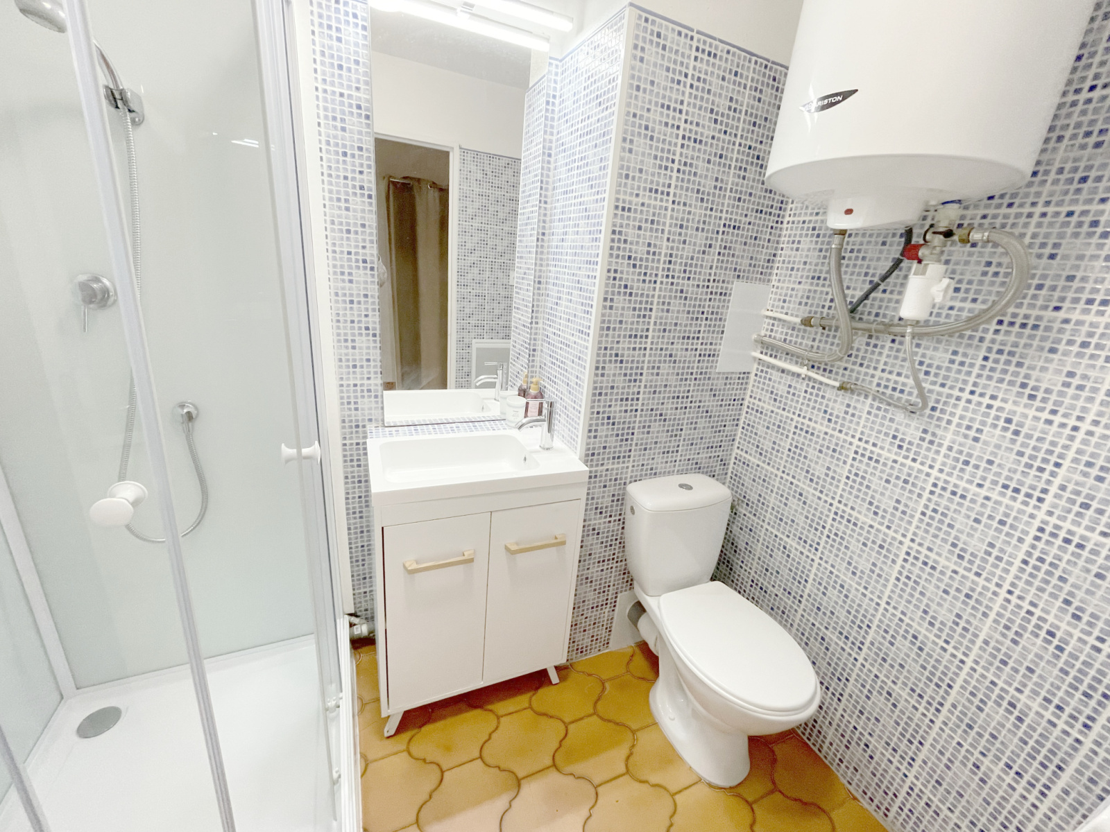 Comprenant , un hall d'entrée avec emplacement pour lits couchettes , une salle d'eau à l'italienne avec wc , une lumineuse pièce de vie avec salon-séjour - cuisine us aménagée donnant sur une loggia ouverte de plus de 7m2 .
