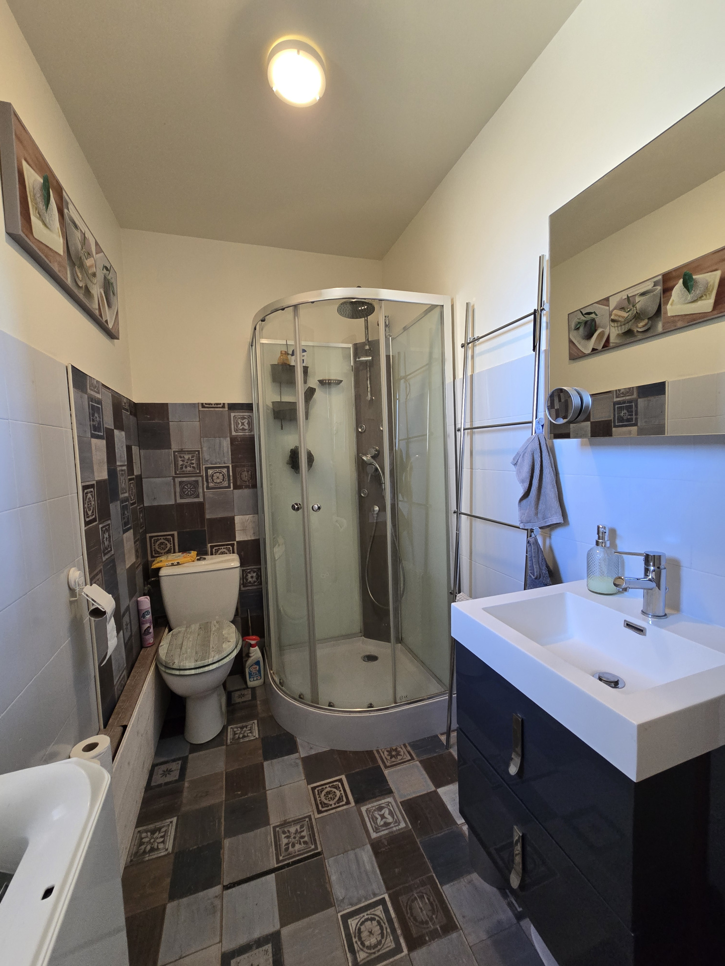 Celui ci est composé d'une entrée avec rangements, d'une cuisine aménagée ouverte sur le sur séjour donnant sur un balcon avec vue sur le jardin paysager et la piscine, une salle d'eau avec des W.C., à l'étage: une chambre et un coin nuit.