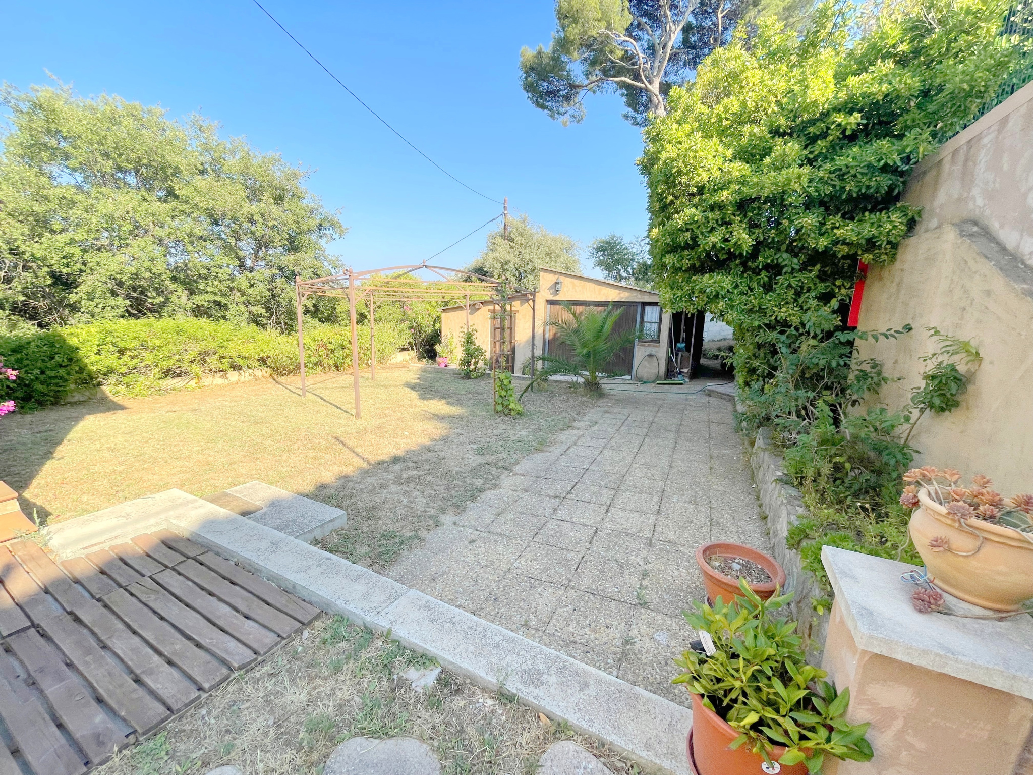 Edifiée sur un terrain plat de 1425 m2 agrémenté de larges restanques avec des possibilités d'agrandissements et entouré de verdure et d'essences méditterranéennes !